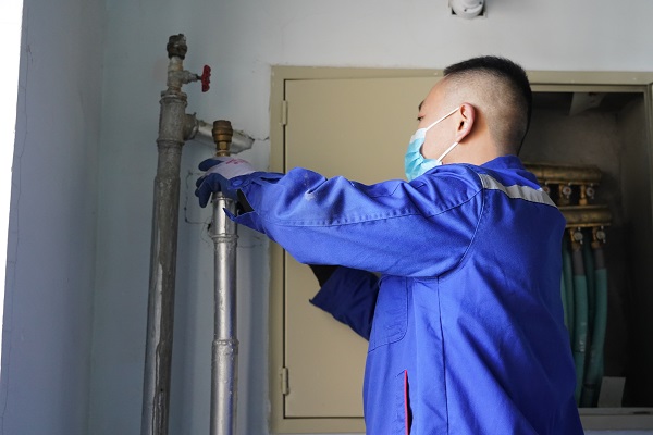 工作人員上門后,發(fā)現(xiàn)入戶閥門未打開。由于閥門長時(shí)間未開啟,工作人員一開啟,熱水一下子噴了出來,打濕了工作人員的衣服。羅阿姨覺得非常抱歉,不停地說,"辛苦了,這么冷的天,厚衣服都濕透了。"