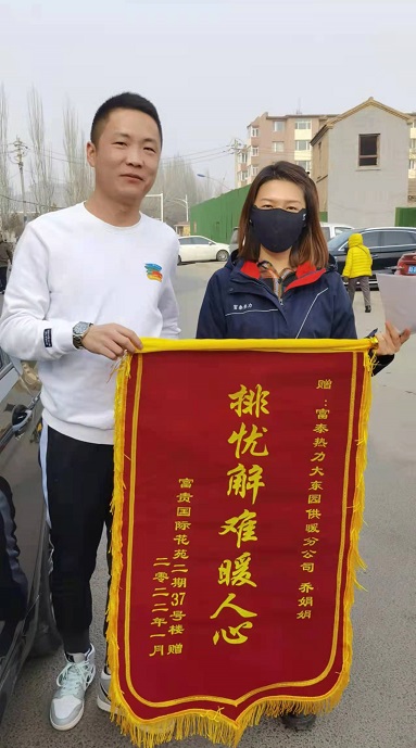 玉泉分公司員工喬娟娟在富貴國際花園走訪時(shí)得知小區(qū)二期37號(hào)樓進(jìn)入11月份后整棟樓就出現(xiàn)溫度偏低現(xiàn)象,她和同事們迅速開始排查原因。該棟樓共有5層10戶熱用戶,他們用了一天時(shí)間逐層逐戶對(duì)熱用戶家中的濾網(wǎng)進(jìn)行了清洗,但是效果不是很理想。于是他們又對(duì)負(fù)一層主管網(wǎng)的除污器進(jìn)行了清洗,一系列的操作完成后又是整整一天,第二天回訪熱用戶時(shí)得知溫度只提升了2度,為了讓熱用戶溫暖過冬,喬娟娟又和同事們對(duì)該棟樓主管道的所有支管進(jìn)行了沖洗,再次回訪熱用戶時(shí)發(fā)現(xiàn),該棟樓其他熱用戶家中溫度都很好,只有301熱用戶家中的溫度還是偏低,為了找到原因,喬娟娟和同事們對(duì)用戶家中的暖氣管道敷設(shè)情況進(jìn)行了測(cè)量,再次沖洗了管道,同時(shí)積極聯(lián)系到已經(jīng)辦理停供的401熱用戶進(jìn)行了復(fù)供,該熱用戶家中溫度偏低問題得到解決。"排憂解難暖人心"為了表達(dá)感謝之情,1月9日,301熱用戶聯(lián)系到了正在小區(qū)走訪的喬娟娟,親手遞給她一面錦旗。