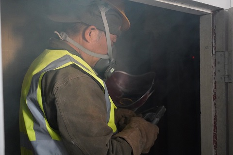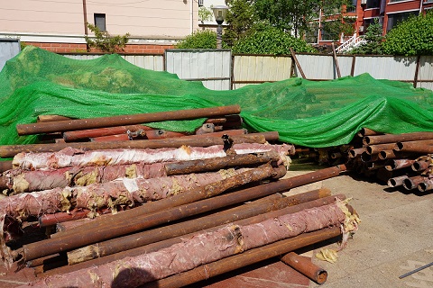 5月17日,筆者來(lái)到開(kāi)天花園小區(qū)的供熱二次管網(wǎng)改造施工現(xiàn)場(chǎng)。在高層單元樓的管道井里,工人正在狹窄的空間里作業(yè),將單元樓道內(nèi)的立管進(jìn)行切割拆除。在施工材料現(xiàn)場(chǎng),西北角堆滿了拆除下來(lái)的地溝管,部分管道腐蝕嚴(yán)重,布滿了密密麻麻的窟窿眼兒;東北角堆放了新到的管材,工人們正在進(jìn)行單元立管外表的打磨工作,打磨完成后再進(jìn)行粉刷兩遍防腐漆。