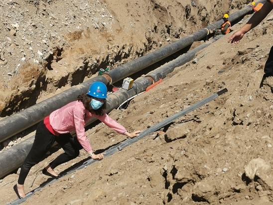 筆者帶好安全帽,也順著工人們下溝的唯一路徑----一個近乎垂直立在溝邊梯子下到溝里,每走一步,周圍的土就在"簌簌"的往下掉,筆者的心也跟著這些土渣心驚膽戰(zhàn)。來到管道溝里,兩根粗粗的管子并排向遠方延伸去。管溝雖然深,但是并不寬,作業(yè)空間不大。