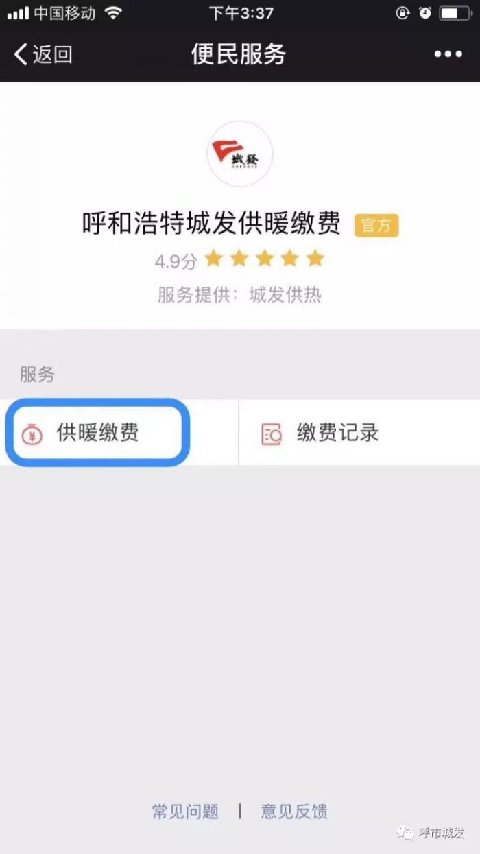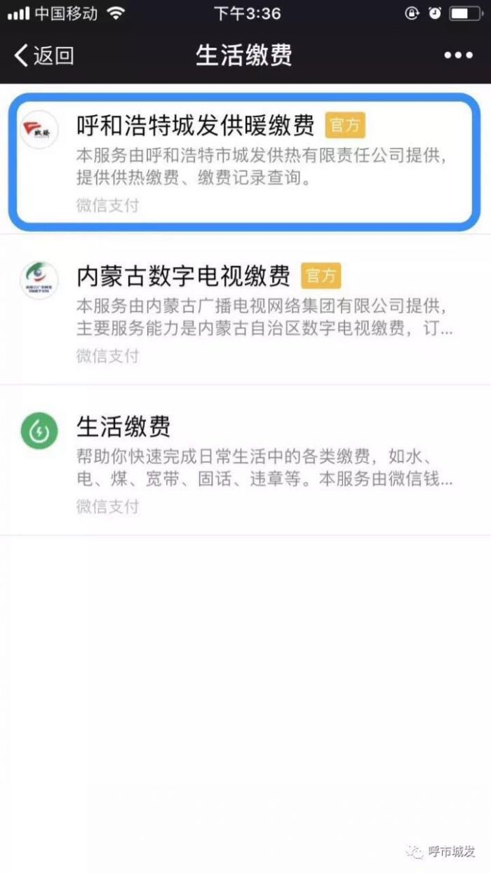 正確的微信繳費(fèi)流程:我-錢(qián)包-城市服務(wù)-便民服務(wù)(生活繳費(fèi))-呼和浩特城發(fā)供暖繳費(fèi)(官方)
