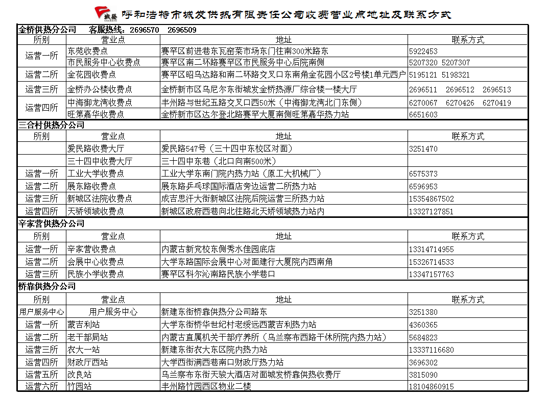 城發(fā)供熱公司收費(fèi)營業(yè)點(diǎn)地址及聯(lián)系方式